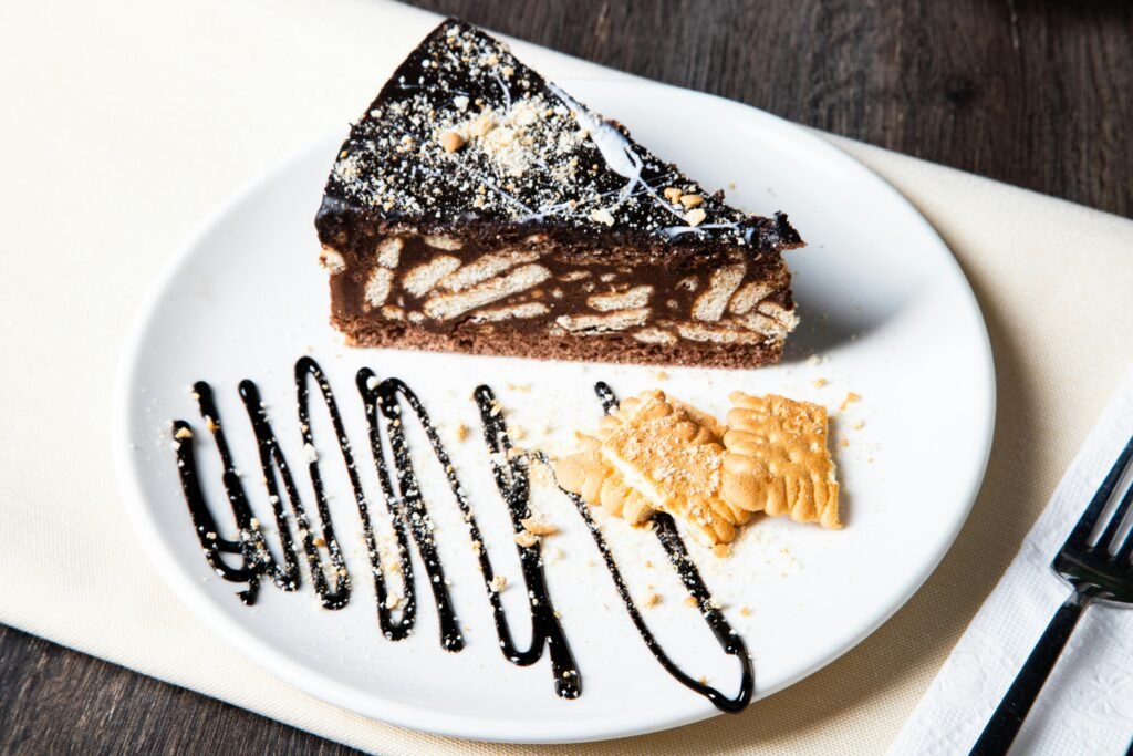 Sonrasında hemen sosunu hazırlamaya geçin. Küçük bir tencerede süt, şeker, kakao, eritilmiş tereyağı ve vanilini alıp karıştırın. Şeker eriyip karışım kaynama noktasına gelince altını kapatın. Sonra ılımaya bırakın çünkü çok sıcak dökerseniz bisküviler hamur olur.