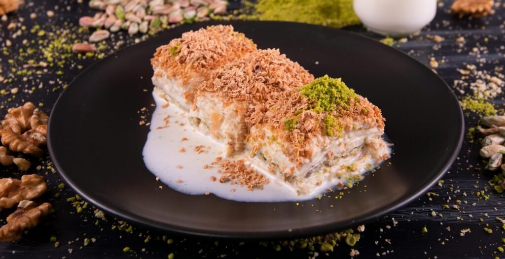 Yufkalar da hazır olduğuna göre dilimleme ve pişirme aşamasına geçelim. Tatlıyı kare veya baklava şeklinde dilimleyin. Önceden ısıtılmış 170°C fırında, altı üstü kızarana kadar yaklaşık 35–40 dakika pişirin. Fırın tipine göre süre değişebilir, üzeri güzelce kızarınca çıkarabilirsiniz.